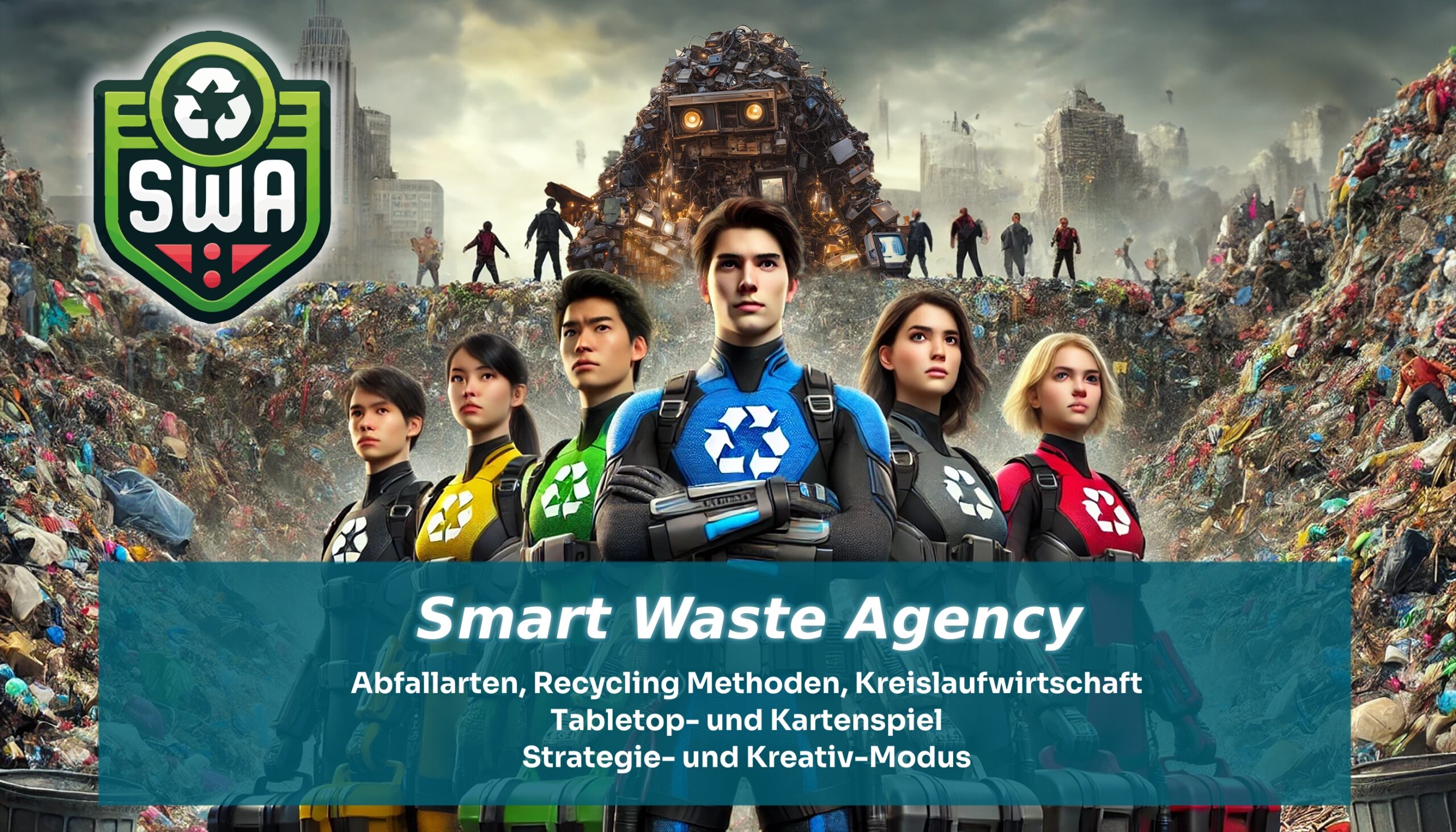 The Smart Waste Agency Game (The SWAG) ist ein unterhaltsames Open-Source Tisch- und Kartenspiel. Spieler:innen tauchen als schlaue Agent:innen in eine Welt aus Müllmonstern (Abfallarten), smarten Multi-Tools (Recycling Methoden) und das „Große Circular“ (Kreislaufwirtschaft) ein. Das Spiel fördert dabei Kreativität, Kollaboration, Klima-Bewusstsein, Strategie und Spaß.
